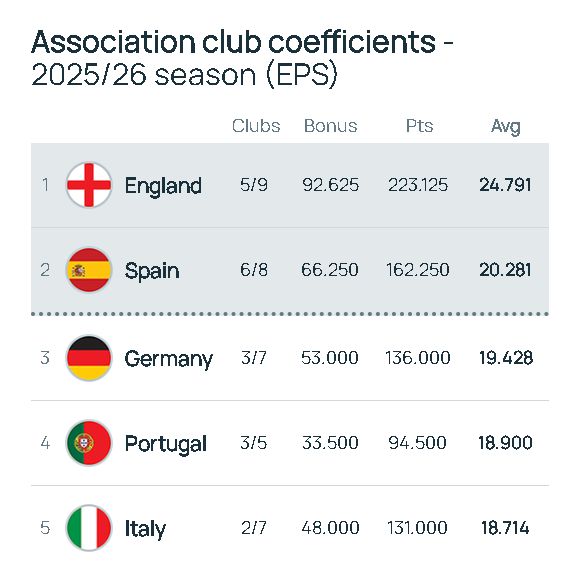 回到前面提及的,EPS排名前两位的联赛,获得的是多一个欧冠参赛名额,英超本有四个名额,第五名维拉靠欧联杯夺冠进了欧冠,第六名利物浦欧冠夺冠参与欧冠,增加的一个名额就会顺延给英超第七名。